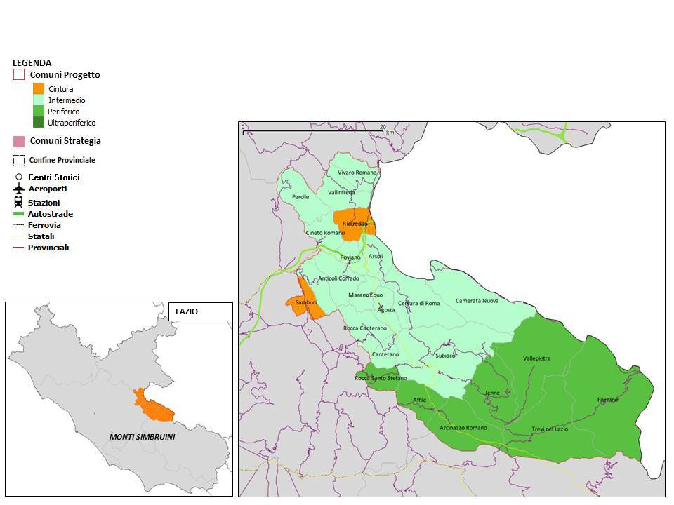 Il territorio dell‘Area Interna 3 del Lazio, dei Monti Simbruini e Terre d’Aniene, interessa 24 Comuni, tutti all’interno della Città Metropolitana di Roma Capitale e della Comunità Montana X della Valle dell’Aniene, eccezion fatta per Filettino e Trevi nel Lazio, della Provincia di Frosinone, che appartengono alla Comunità Montana dei Monti Ernici Simbruini, ed è intimamente connesso con i restanti 9 Comuni della Comunità Montana della Valle dell’Aniene.