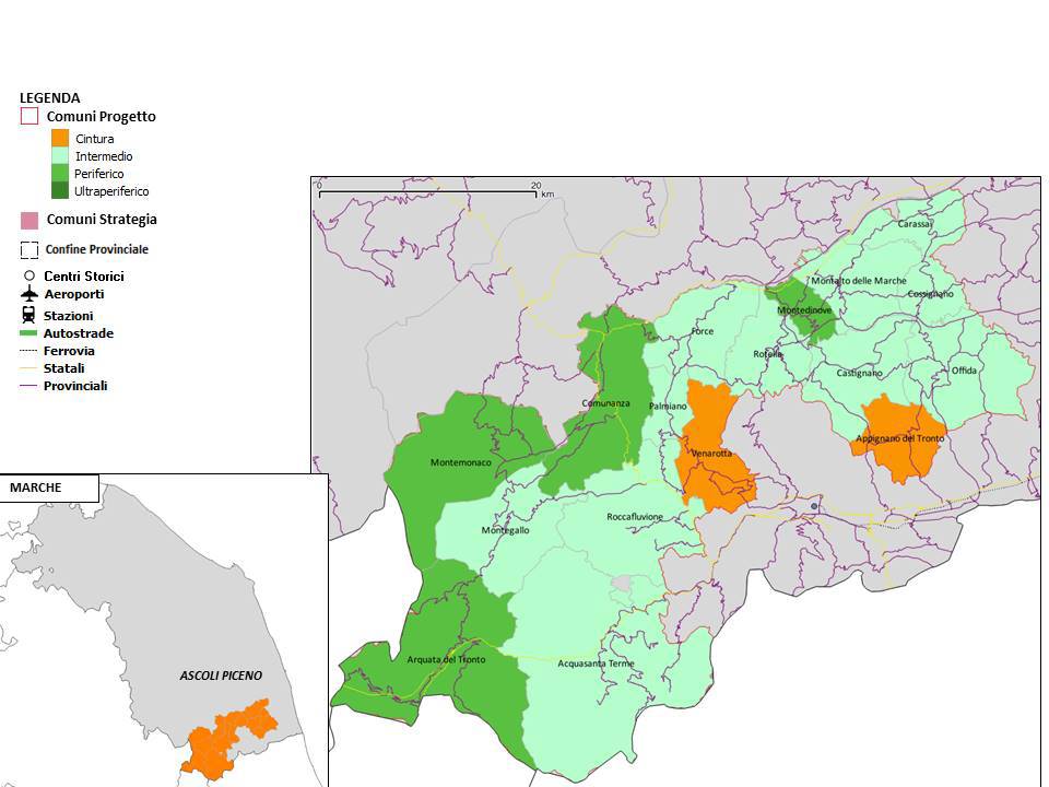 La Strategia dell’area interna “Ascoli Piceno” interessa un ambito di 17 Comuni tra il bacino del Tronto a sud e quello dell’Aso a nord. Sono quelli di Acquasanta terme, Appignano del Tronto, Arquata del Tronto, Carassai, Castignano, Comunanza, Cossignano, Force, Montalto delle Marche, Montedinove, Montegallo, Montemonaco, Offida, Palmiano, Roccafluvione, Rotella, Venarotta. L'area interna rappresenta circa il 60% del territorio della provincia di Ascoli Piceno, e vi abitano 28.700 persone.