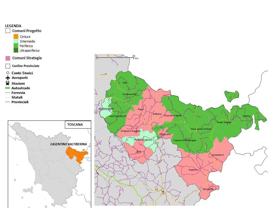 Il territorio dell’Area Interna “Casentino-Valtiberina”, localizzato nella parte più ad est della Toscana, al confine con l’Emilia-Romagna e le Marche, comprende i 17 Comuni aderenti e/o convenzionati alle due Unioni dei Comuni del Casentino e della Valtiberina: una fitta rete di insediamenti, strade, valichi e profili montuosi, territori di passaggio della catena appenninica fin dall’antichità.