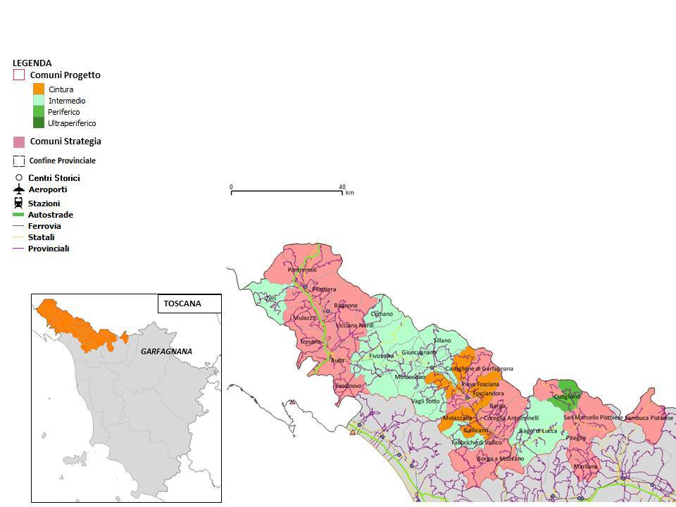 L’area, posta nella parte più a nord della Toscana, tra le Alpi Apuane e l'Appennino tosco-emiliano, confinante sia con la Liguria che con l’Emilia, è composta da 38 comuni. L’area progetto, più stretta e totalmente montana, a favore della quale si realizzano gli interventi, è di 19 comuni tutti periferici o ultraperiferici con una popolazione di 38.000 abitanti, su una superficie di 1.063,4 kmq con densità abitativa di 37,2 ab/kmq, e caratterizzata da una debolezza strutturale e, soprattutto da una elevata distanza dai servizi essenziali che ha determinato lo spopolamento, l'invecchiamento della popolazione, la perdita di funzioni e lo scarso presidio del suolo.