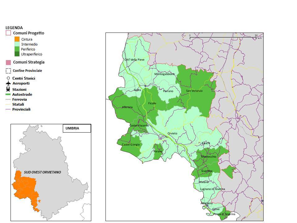 L’area interna dell'Orvietano è composta da 20 Comuni, che fanno da cerniera tra l'Umbria Sud-occidentale, la Toscana e il Lazio: occupano un'area di 1.187 chilometri quadrati, con una densità medio-bassa della popolazione, che dal 1961 si è progressivamente ridotta di circa 12.000 unità, arrivando nel 2014 a 61.601 abitanti. A caratterizzare il paesaggio locale è la sostanziale persistenza di una cultura agricola storica e il mantenimento del sistema policentrico dei borghi storici.