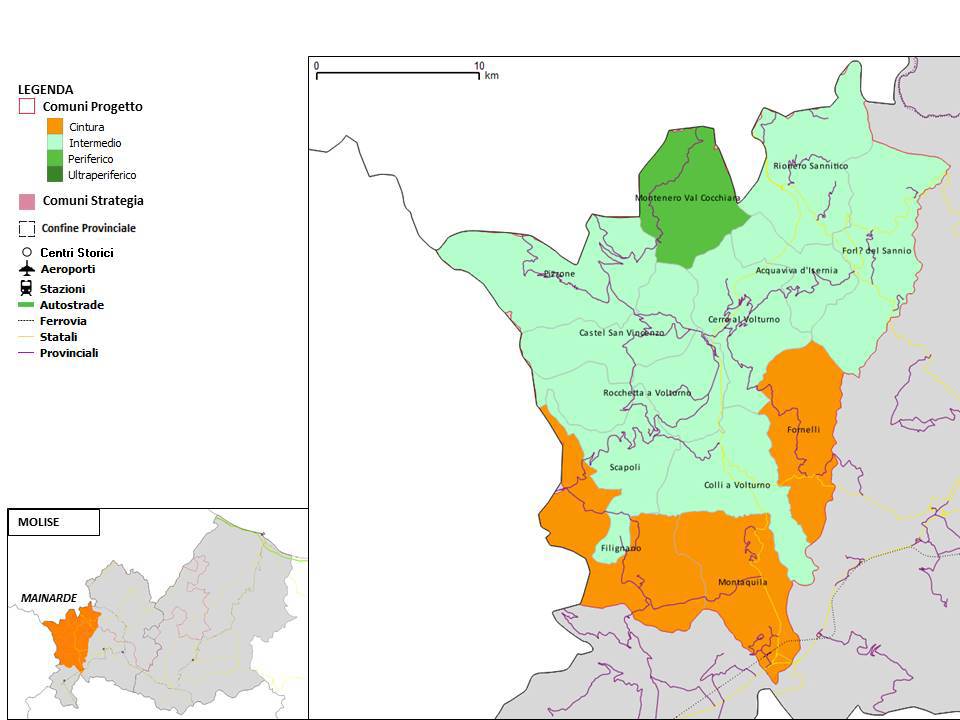 L’unico comune dotato di linea ferroviaria è Montaquila, e 12 Comuni su 13 si trovano in assenza di Banda Larga; l’area appare sempre meno competitiva e sempre più isolata. L’area ha un territorio prevalentemente montano con quote altimetriche che raggiungono i 2.000 m s.l.m. (località più alta risulta l’anticima del monte La Meta, 2.185 m s.l.m. nel comune di Pizzone) e un dislivello medio di circa 1.981 m (la quota più bassa si registra nel comune di Montaquila in corrispondenza della sezione del fiume Volturno in località Mascia-Limate, 204 m s.l.m.). L’area progetto, localizzata tra le montagne del Matese e l’Alta valle del Volturno, costituisce l’accesso al Parco nazionale di Abruzzo Lazio e Molise, rappresenta un’area paesaggisticamente molto suggestiva, unica sotto il profilo naturalistico.