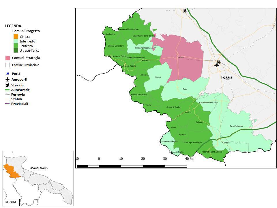 È stata approvata la strategia dell'area interna dei Monti Dauni, che riunisce 29 Comuni della provincia di Foggia, per un totale di quasi 2 mila chilometri quadrati. È un territorio caratterizzato da piccoli borghi contigui, spesso arroccati sui pendii, che guardano alla pianura del Tavoliere delle Puglie nella parte meridionale e affacciano sulla valle del Fortore, nella parte settentrionale.