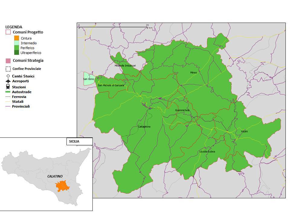 L’Area Interna del Calatino è costituita da un comprensorio di Comuni della Sicilia centro orientale comprendente otto Comuni ricadenti all’interno della città metropolitana di Catania, ed una popolazione complessiva di 76.001 abitanti, l’1,5% della popolazione siciliana (ISTAT, 2018). L’area Interna, che si estende su un territorio pari a 948 km2 è situata tra i monti Erei e gli Iblei ed è attraversata dalla Strada statale 417 che la collega a Catania e a Gela risultando una sorta di crocevia che consente l'accesso a diverse aree della Sicilia: verso nord-ovest, alla Sicilia centrale (e quindi a Piazza Armerina e a Enna), verso nord-est alla Sicilia orientale (a Catania e all'alto siracusano), verso sud al litorale meridionale (a Gela e Licata), verso sud-est alla Sicilia sud-orientale (a Ragusa).