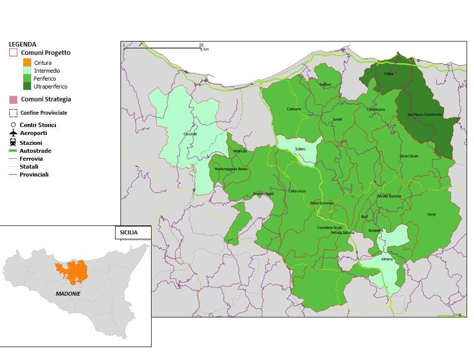 partecipazione di associazioni e cittadini, coadiuvati dai tecnici della Regione Sicilia, del Comitato Tecnico Aree Interne, di Anci e del Crea, ha contribuito a rafforzare i processi di governance territoriale: ha favorito, infatti, la costituzione di una “nuova” Unione dei Comuni delle Madonie, che ha preso il posto delle sei Unioni esistenti, che non garantivano una adeguata capacità di intervento sui servizi di cittadinanza (istruzione, salute, mobilità, agenda digitale). La Strategia d'area, anche alla luce dell'insediamento di numerosi giovani che ritornano all'agricoltura, con forti idealità e competenze innovative, si costruisce attorno al tema dell'accesso alla terra, a partire da un “censimento attivo”, realizzato tramite una ricerca azione, dei terreni incolti e abbandonati, pubblici e privati, e crea uno strumento per sostenere i nuovi insediamenti. Attraverso un apposito studio sostenuto dal Mipaaf si è intanto rilevato che l'area ha caratteristiche agro-energetiche tali da dare un ruolo centrale alle filiere locali di energia rinnovabile. Oggi circa il 52% del fabbisogno elettrico del territorio è soddisfatto da Fonti Energetiche Rinnovabili. La strategia pone l'obiettivo del 100% di copertura del fabbisogno elettrico in 10 anni, attraverso la realizzazione di piccoli impianti da filiere di energia rinnovabile diffusi sul territorio e la creazione di piattaforme di raccolta, trattamento, confezionamento e stoccaggio di biomassa da filiere corte. La strategia si caratterizza anche per una profonda innovazione dell'offerta formativa attraverso la costituzione della Rete Scolastica delle Madonie (portato della formazione della nuova Unione dei Comuni), che riunisce tutte le scuole dell'area con lo scopo di innovare i percorsi formativi e razionalizzare i servizi scolastici. Per migliorare i test Invalsi e potenziare le aree disciplinari di