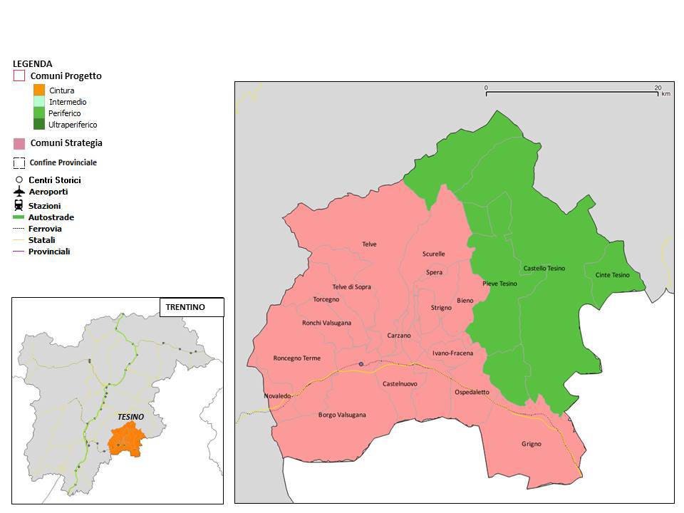 - Il primo riguarda il rafforzamento delle connessioni e delle reti locali e sovra locali sia attraverso infrastrutture digitali, con l'espansione dell'accesso alla rete di banda larga, sia fisiche con la realizzazione del TESINO RING, un anello ciclopedonale tra i tre Comuni, per rendere più agevole la mobilità sostenibile nell’Area e migliorarne la fruizione anche da un turismo “slow”. Questo anello potrà integrarsi con la ciclabile della Valsugana, uno dei principali itinerari ciclabili d’Europa, sul tracciato dell’antica via Claudia Augusta.