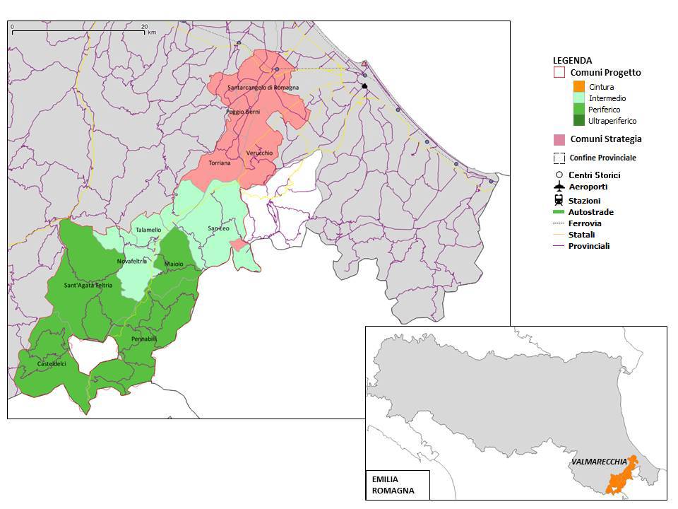 I sette comuni dell’Alta Valle (Casteldelci, Maiolo, Novafeltria, Pennabilli, San Leo, Sant’Agata Feltria, Talamello) costituiscono l’area progetto e, insieme ai comuni dell’area strategia (Santarcangelo di Romagna, Verucchio e Poggio Torriana) formano l’Unione di Comuni Valmarecchia.