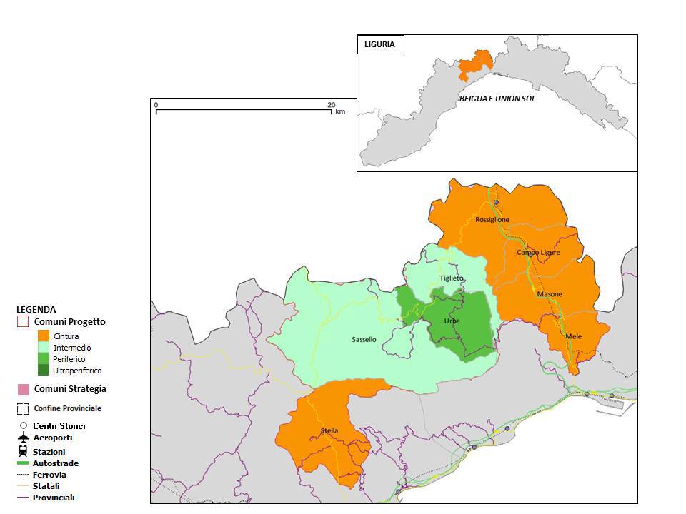 L’area progetto Beigua-Sol è situata nella parte centrale della Regione Liguria, a cavallo tra la Città metropolitana di Genova e la provincia di Savona; comprende 8 comuni interamente montani per un totale di oltre 300 kmq, una popolazione di quasi 19.000 abitanti e una densità media di. di 57 abitanti per kmq. Buona parte dell’area è interessata sia dal Parco Naturale Regionale del Beigua, la più vasta area naturale protetta della Liguria, sia dal sito UNESCO denominato Beigua UNESCO Global Geopark, entrambi gestiti dall’Ente Parco del Beigua.