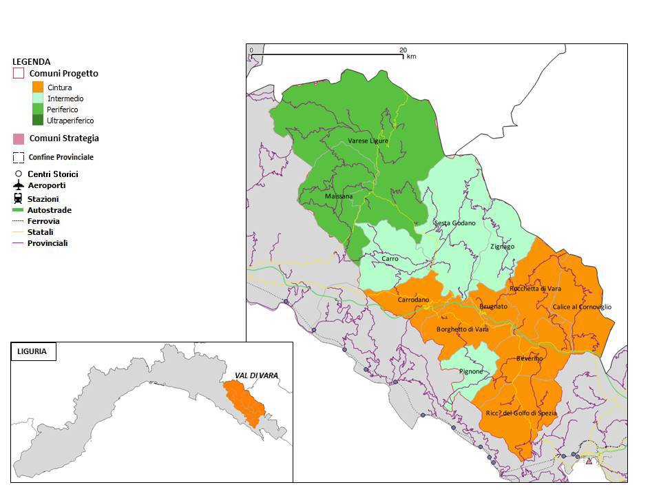 La Val di Vara occupa circa due terzi del territorio della provincia della Spezia ed è la più grande vallata della Liguria. Prende il nome dall’omonimo fiume che nasce dal monte Zatta e si getta nel fiume Magra, di cui è il maggior affluente, dopo una sessantina di chilometri. L’area progetto comprende 13 comuni per una superficie di 529 Kmq ed un totale di 15.791 abitanti (al 1° gennaio 2020), distribuiti su oltre 100 frazioni con una densità di meno di 30 abitanti per kmq. La popolazione di over 65 è pari al 31,2% e la perdita di superficie agricola utilizzata nei primi dieci anni dal 2000 è stata del 13,6%.