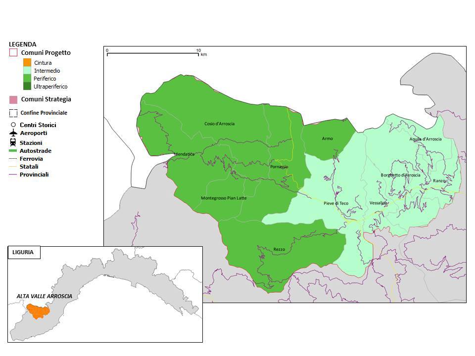 d’Arroscia, Borghetto d’Arroscia, Cosio d’Arroscia, Mendatica, Montegrosso Pian Latte, Pieve di Teco Pornassio, Ranzo, Rezzo e Vessalico, per una superficie di 254 Kmq (circa un quarto della provincia di Imperia) ed un totale di 4.435 abitanti distribuiti su oltre 40 frazioni.