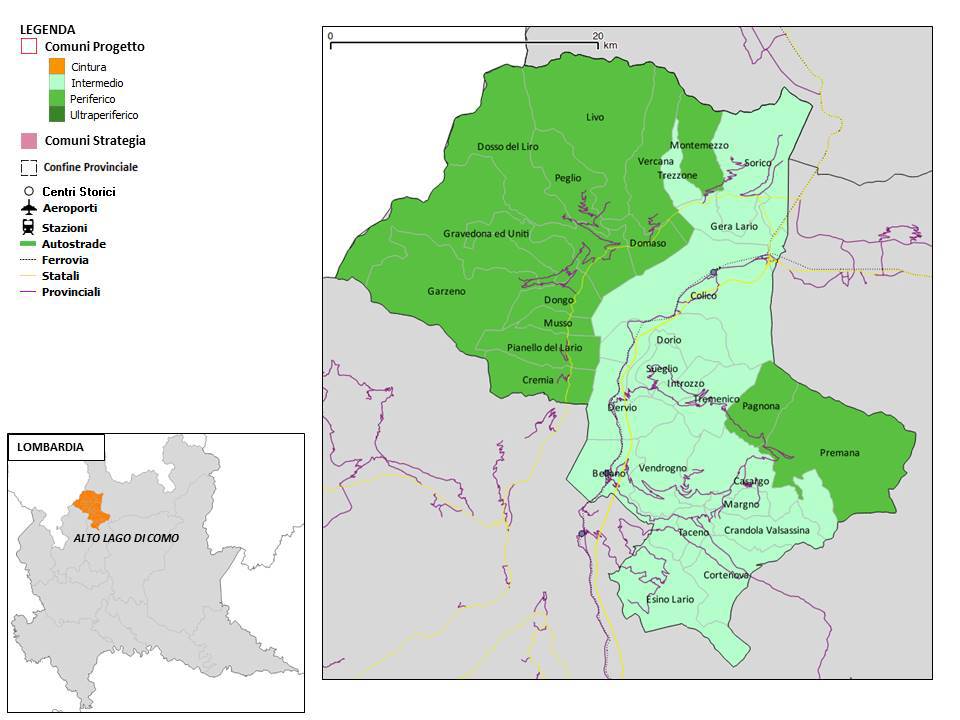 L’area interna “Alto Lago di Como e Valli del Lario” comprende 32 Comuni equamente distribuiti tra le province di Como e di Lecco. Il suo territorio si estende dalle sponde lacuali alle valli più interne, per una superficie complessiva di 450 kmq, con una forte differenza altimetrica: è possibile passare in pochi chilometri da 200 a 2000 metri slm. La densità abitativa media è bassa (87,28 abitanti per kmq), in un contesto caratterizzato dalla presenza di molti piccoli Comuni: quasi il 70% ha meno di 1000 abitanti e il 30% meno di 300.