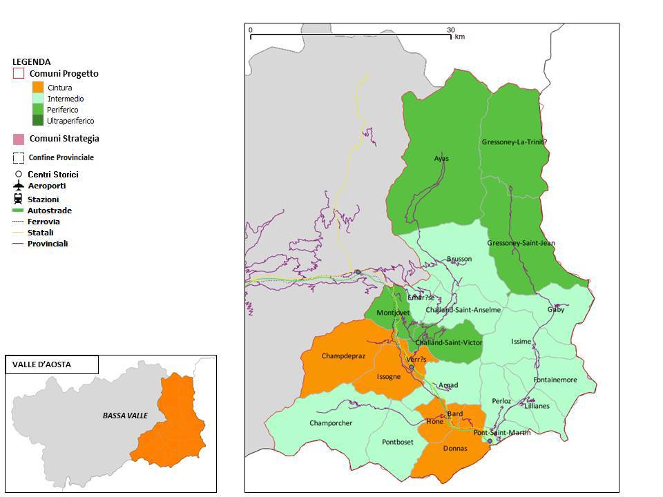 L'area più marginale, e di conseguenza a rischio, è considerata quella di media montagna, con Comuni che non superano i 500 abitanti. Lo scenario desiderato e delineato nella Strategia è quello di una Bassa Valle consapevole della propria identità di territorio “di montagna” e di destinazione turistica d’eccellenza. Una comunità cosciente che i “piccoli numeri”, perdenti nell’economia di scala, creano in Bassa Valle, specificità e qualità culturali, enogastronomiche e ambientali, vincenti nel mercato del turismo.
